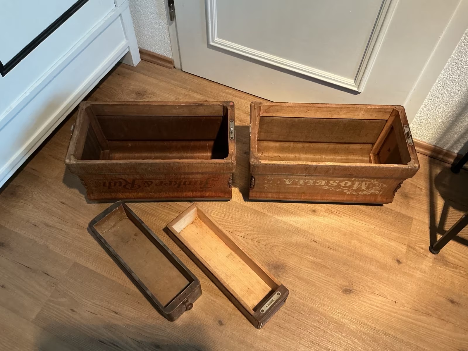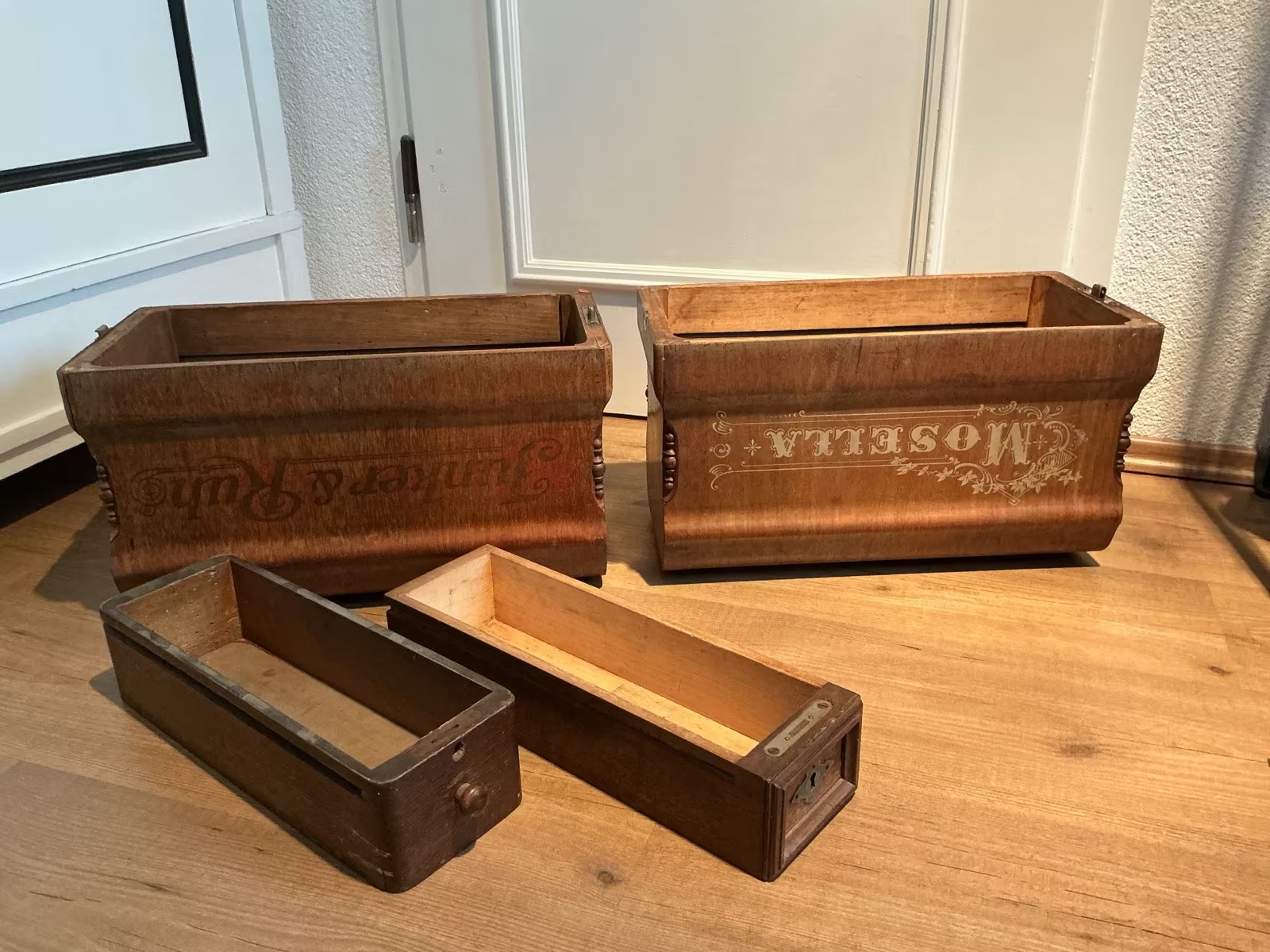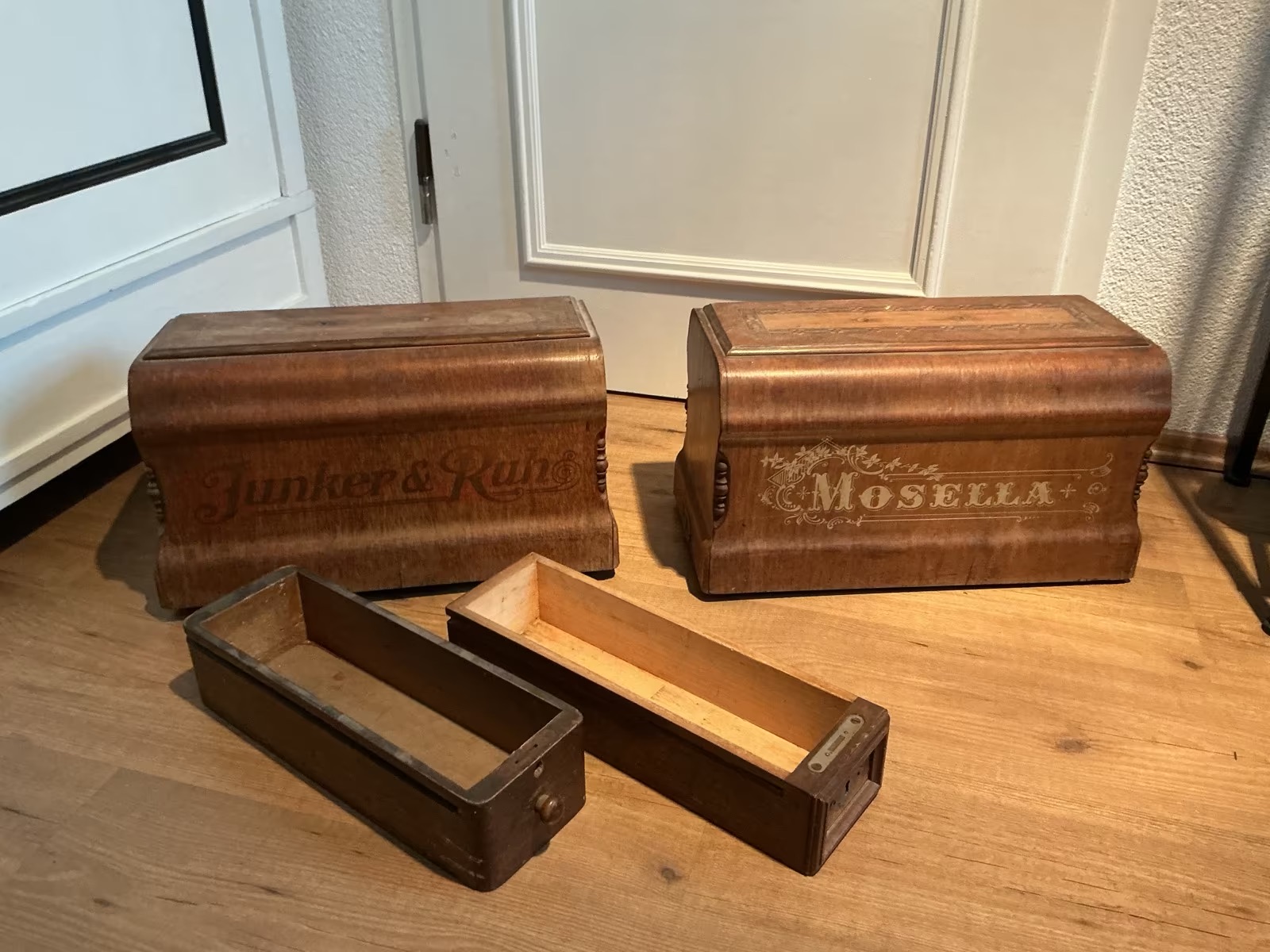 2 antike Holzkisten, alte Nähmaschinenoberteile (Deko, Blumenkästen)2 antike Holzkisten, alte Nähmaschinenoberteile (Deko, Blumenkästen)2 antike Holzkisten, alte Nähmaschinenoberteile (Deko, Blumenkästen)