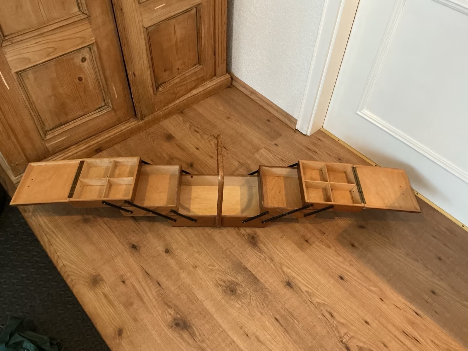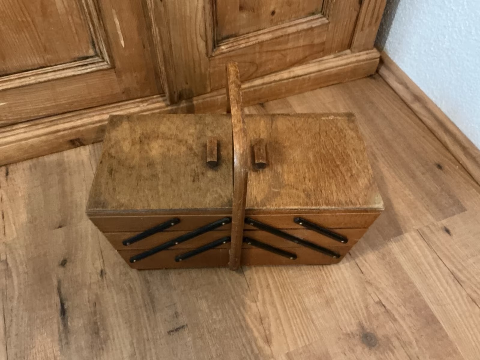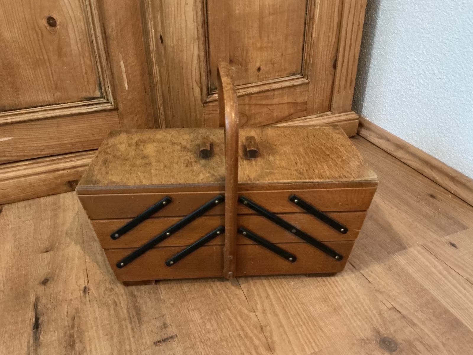 Mid Century Nähkasten aus Holz, Ziehharmonika, Aufbewahrung (50er Jahre)