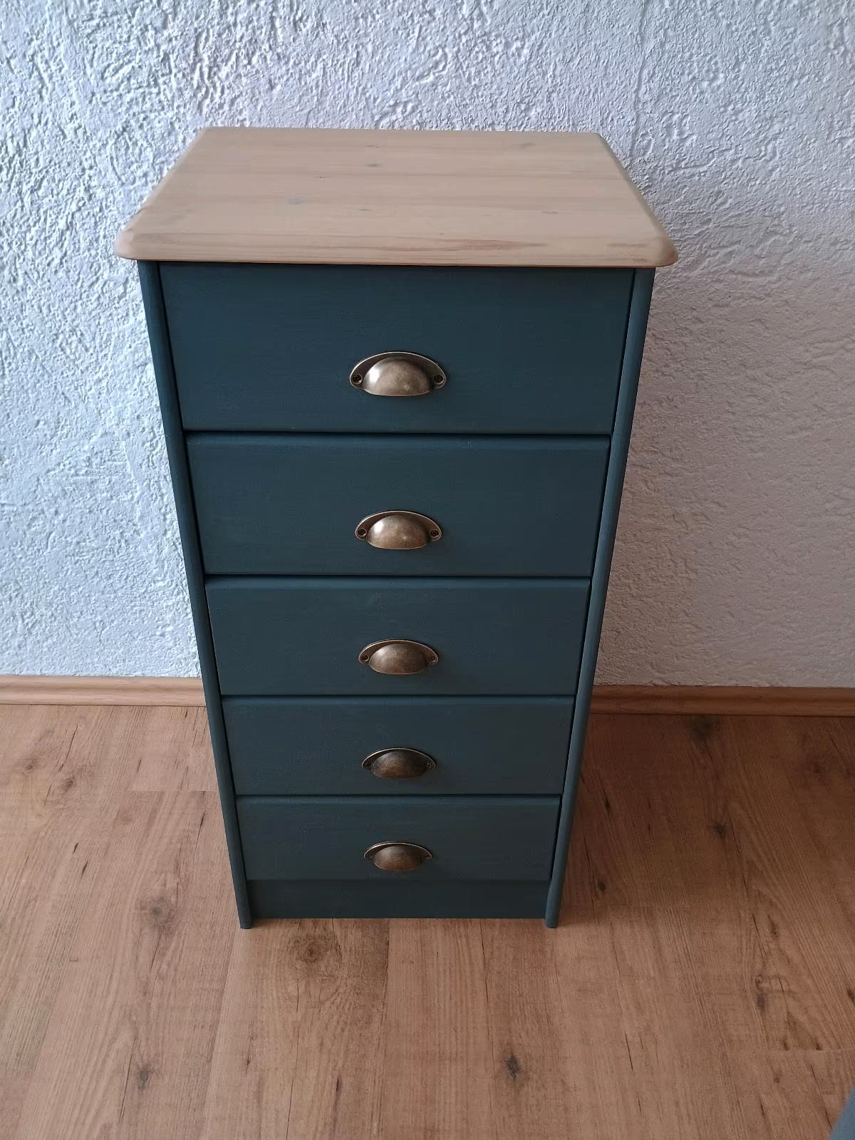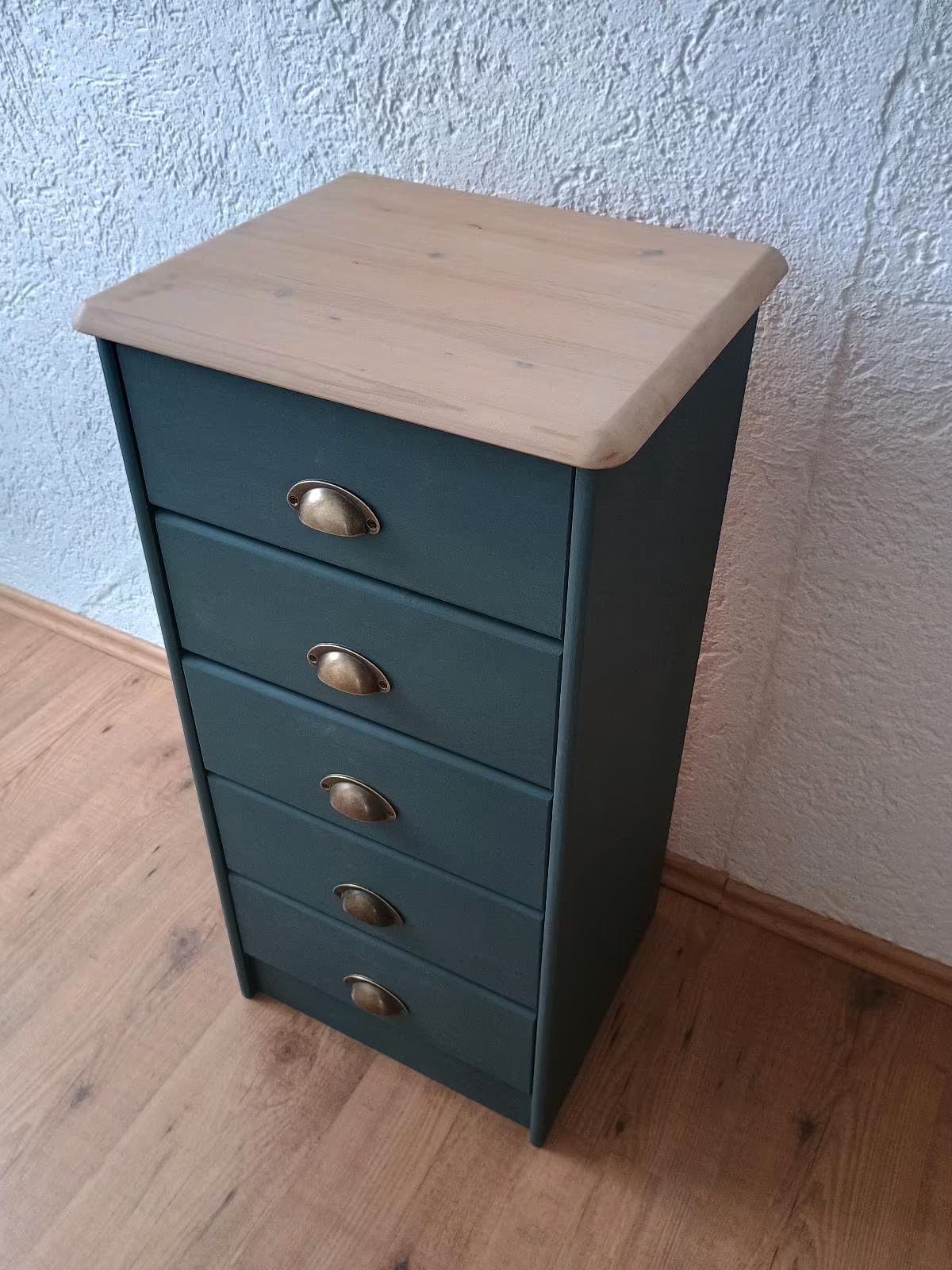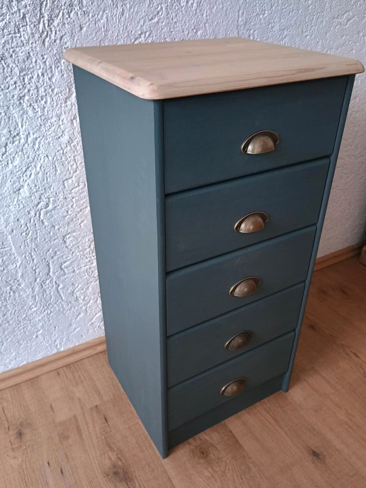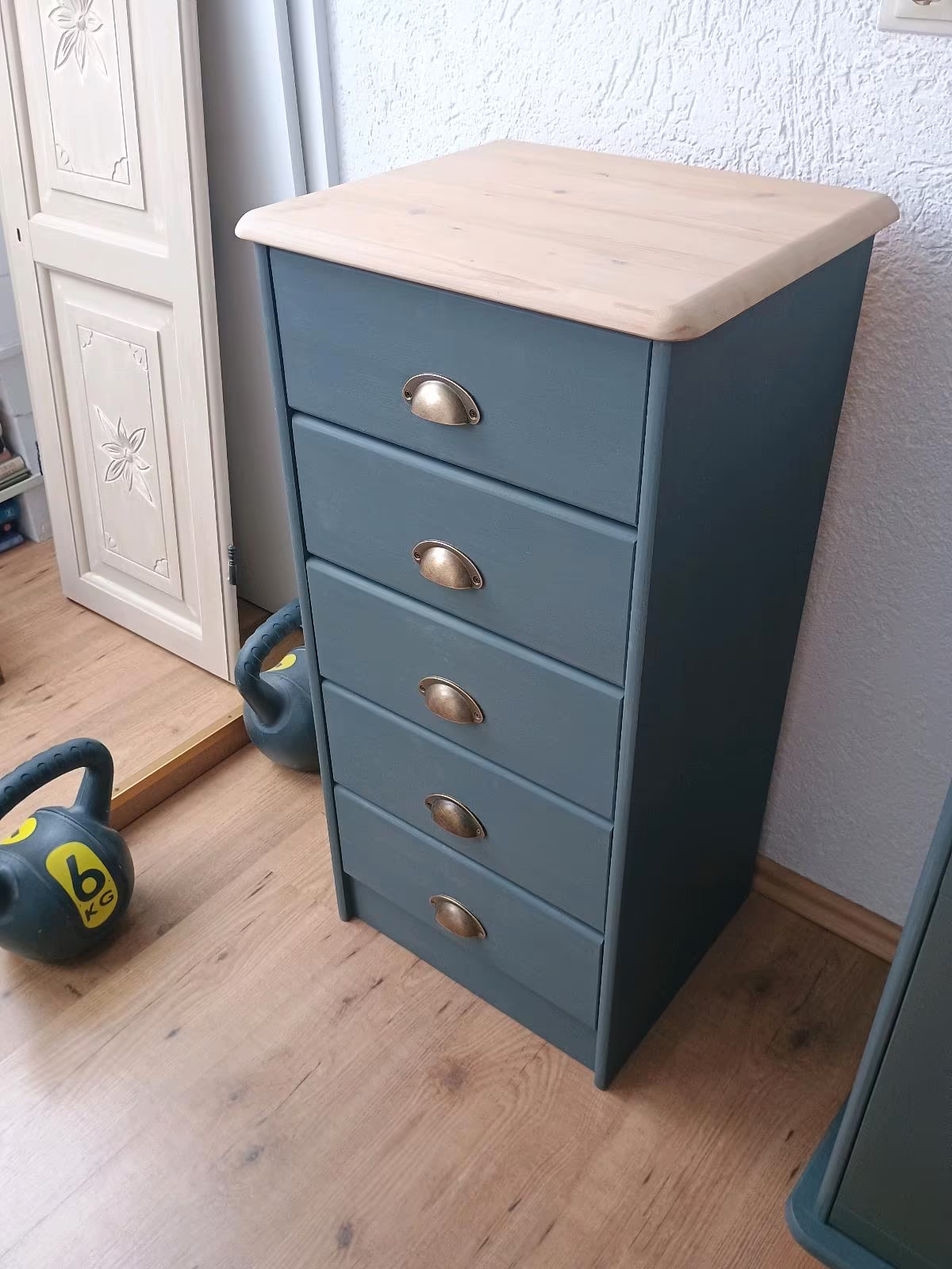 Das Schränkchen wurde abgeschliffen, neu lackiert und mit Bienenwachs versiegelt.